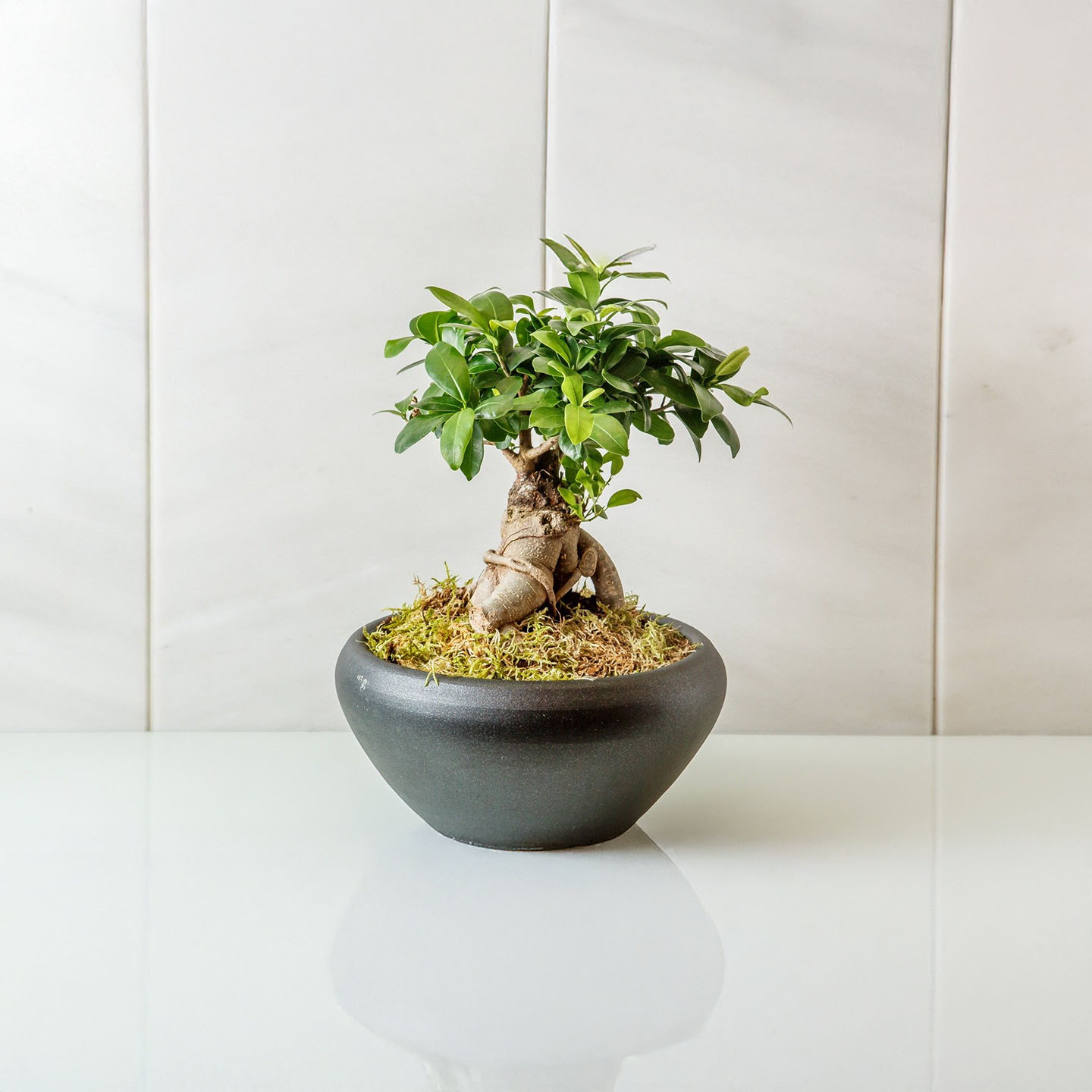 Μπονσάι σε γλάστρα, ιδανικό για διακόσμηση εσωτερικού χώρου. Ανθεκτική επιλογή που δίνει ζωντάνια και στιλ σε σπίτι ή γραφείο.
